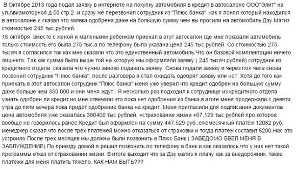 Опять же используются описанные выше психологические приемы. Человек из другого города приезжает в Москву, с единственной целью - добраться до автосалона, где он заранее заказал себе автомобиль, и купить это авто. У заемщика ограниченный запас времени и он настроен на быструю покупку. Этим и пользуются менеджеры, «впаривая» другие комплектации и даже другие автомобили, заключая договоры на иных условиях, подключая дополнительные платежи, которые значительно увеличивают сумму кредита. Для того чтобы клиент на это пошел, необходимо просто «промариновать» его в салоне 5-7 часов, и тогда он согласится на любые условия. Но, даже если не согласится, то страховку жизни и здоровья, например, просто включат без согласия клиента. При оформлении кредита нужно будет подписать огромное количество документов, и уже дома, разбирая бумажки, клиент обнаружит, что среди них есть и страховой полис. В полисе, конечно-же, будет указано, что услуга по страхованию жизни никак не зависит от получения кредита, поэтому заемщику не останется ничего другого, кроме того, чтобы платить. Если клиент будет возмущаться, то его успокоят, солгав, что через месяц можно будет от страховки отказаться, а полученные деньги потратить на досрочное погашение кредита. Как вы уже знаете, это ложь.