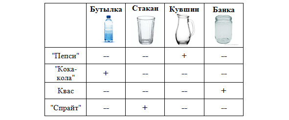 Так как каждая жидкость находится только в одном сосуде, то в в каждой строчке и каждом столбце может стоять только один «+». Взглянув на таблицу, можно сделать вывод, что «Пепси» в кувшине, а квас в банке. Получаем новую таблицу: