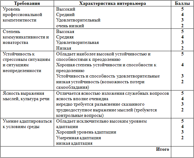 После прохождения теста, основываясь на данных критериях, делается оценка кандидата по избранной, например, пятибалльной шкале (отлично – 5; хорошо – 4; удовлетворительно – 3; неудовлетворительно – 2; плохо – 1). Оценки по критериям обычно располагают по нарастающему количественному значению, например, при оценке по критерию «способность к общению с людьми» на должность продавца-консультанта Торгового центра: