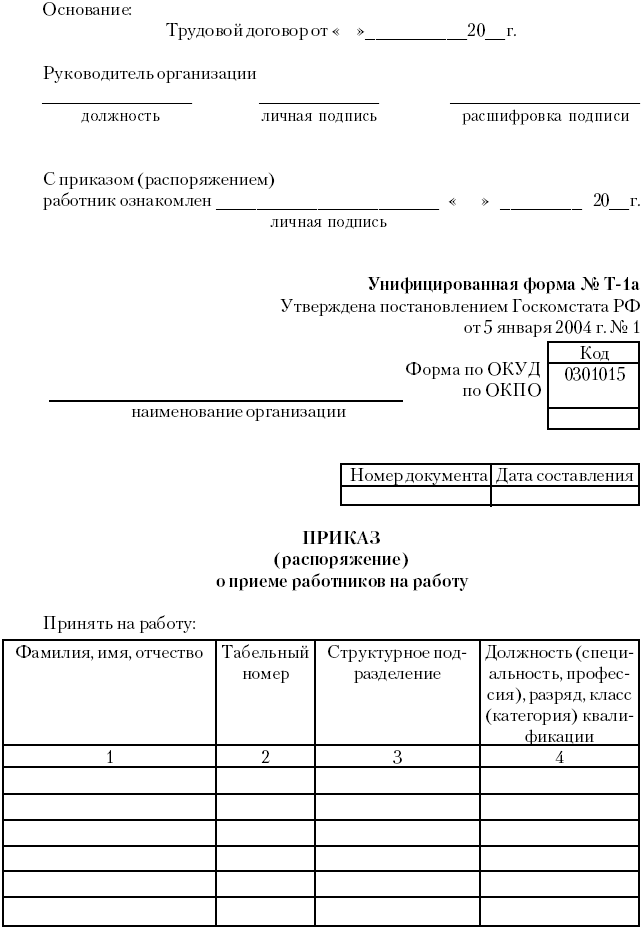 Постановлением Госкомстата России от 5 января 2004 г. № 1. утверждена унифицированная форма приказа (распоряжения) о приеме работника на работу.