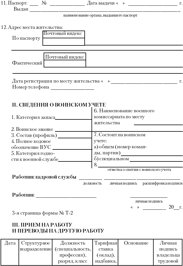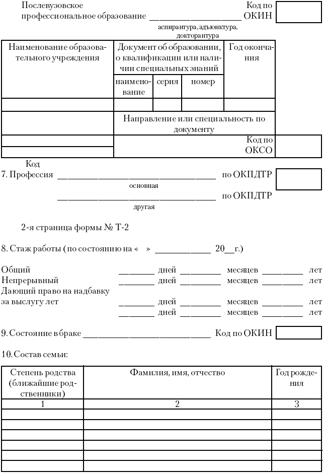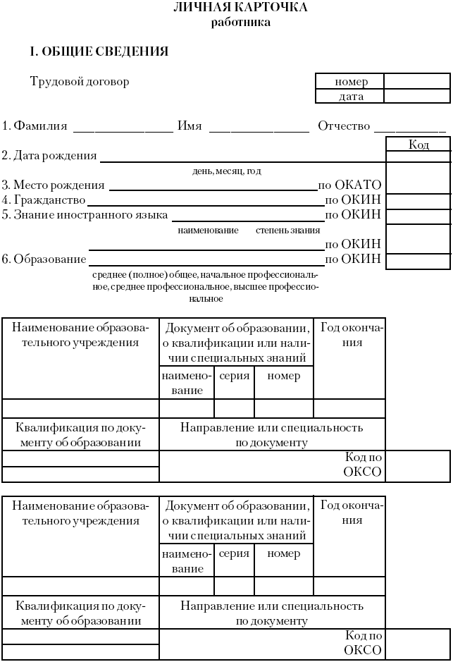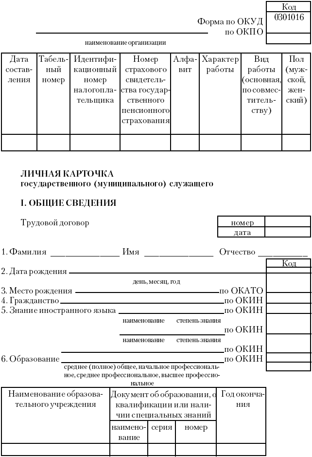 Для учета лиц, которые замещают государственные (муниципальные) должности государственной службы, применяется личная карточка государственного (муниципального) служащего. Заполняя разделы личной карточки, нужно руководствоваться Унифицированной формой № Т-2, которая утверждена постановлением Госкомстата РФ от 5 января 2004 г. № Рассмотрим данную форму подробнее.