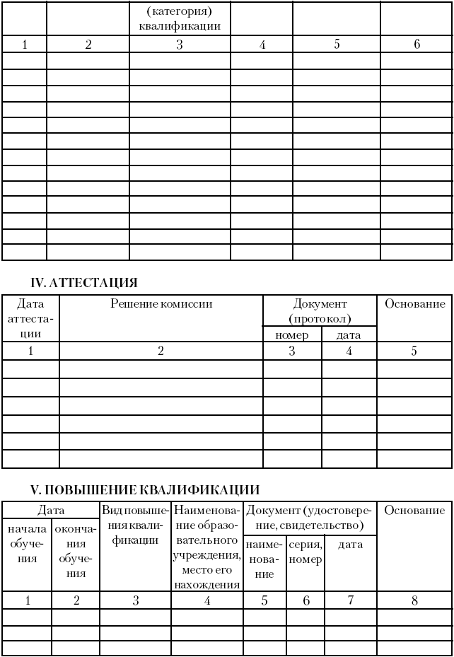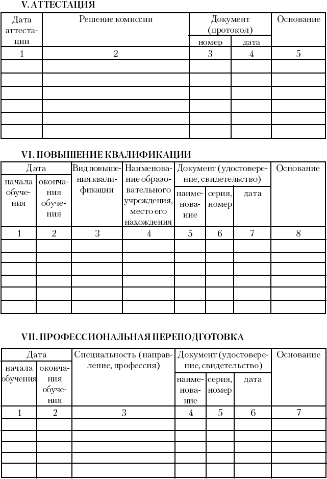 22. Данные о повышении квалификации записываются на основании документов, представляемых при приеме на работу либо поступающих из отдела подготовки кадров. В этом разделе указываются:
