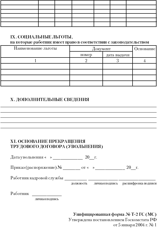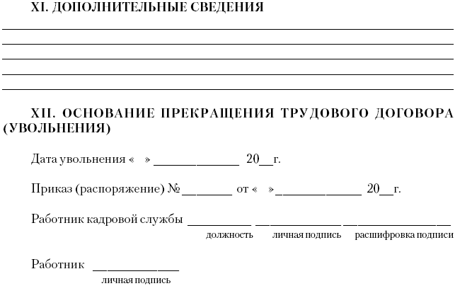 27. После того как сотрудник увольняется из организации, вносятся записи в раздел XI «Основания увольнения», где указывается расшифровка статьи увольнения работника в соответствии с точными формулировками статей увольнения в ТК, дата увольнения, приказ об увольнении. При закрытии личной карточки Т-2 ставят свою личную подпись работник кадровой службы, с расшифровкой подписи и указанием должности, а также работник. Подпись работника в этом случае подтверждает его согласие со всеми записями, внесенными в его личную карточку.