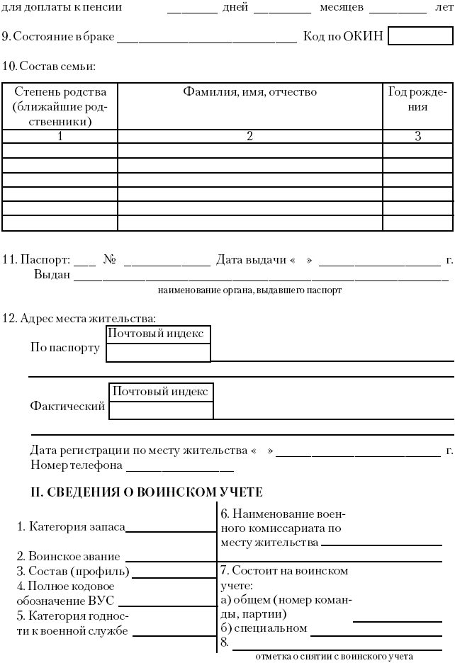 8. Фамилия, имя, отчество записываются полностью и разборчиво. Фамилию желательно смещать к левому краю, чтобы в будущем при ее изменении можно было внести соответствующие исправления (зачеркнуть старую одной тонкой чертой и записать новую) в соответствии с представленными в отдел кадров документами.