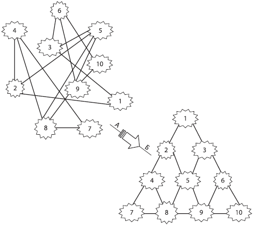 Необходимой предпосылкой для использования имеющейся информации в целях получения дополнительной или новой информации о проблемной ситуации является способность постановщика проблемы к особой перегруппировке и адаптации информации, содержащейся в описании проблемной ситуации. Графической иллюстрацией подобной процедуры является изображенное на рис. 1.3 преобразование первоначальной структуры описания проблемной ситуации (состояние А) в иерархически систематизированную структуру (состояние Б).