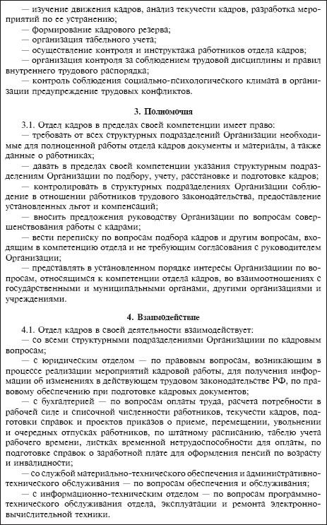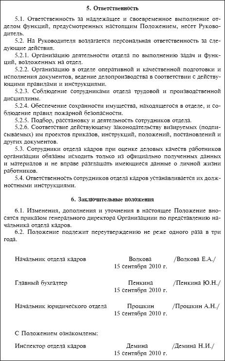 В разделе «Ответственность» определяют ответственность начальника отдела кадров за выполнение возложенных на него функций и ответственность работников отдела, которая устанавливается должностными инструкциями.