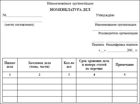 Номенклатура дел – это разработанный по установленной форме систематизированный перечень наименований (заголовков) дел, заводимых организацией в процессе осуществления своей деятельности, с указанием сроков их хранения. В большинстве случаев разработка номенклатуры дел в организации (или сводной номенклатуры дел) осуществляется на основе номенклатур дел структурных подразделений, в том числе бухгалтерской службы (иного подразделения, выполняющего ее функции).