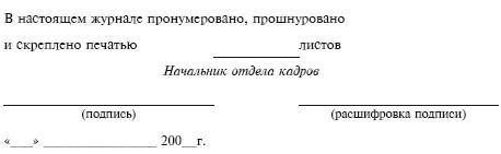 2) листы журнала нумеруются по порядку и шнуруются. На узел шнуровки листов на последней странице делается наклейка с оттиском печати отдела кадров или организации. При этом на последней странице делается заверительная надпись:
