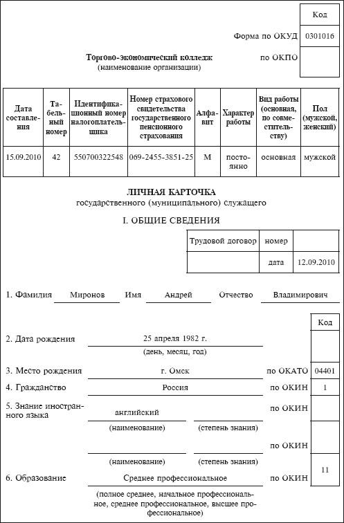 Рассмотрим порядок заполнения личной карточки государственного (муниципального) служащего (форма № Т-2ГС (МС)).