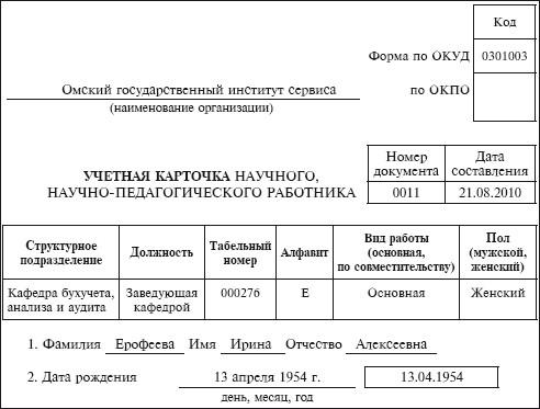 В Омский государственный институт сервиса 21 августа 2010 г. была принята на работу, на должность заведующей кафедры «Бухгалтерского учета, анализа и аудита» Ерофеева Ирина Алексеевна. На основании предоставленных документов начальник отдела кадров Ломзова В.Е. заполнила на вновь принятого работника учетную карточку (форма № Т-4).