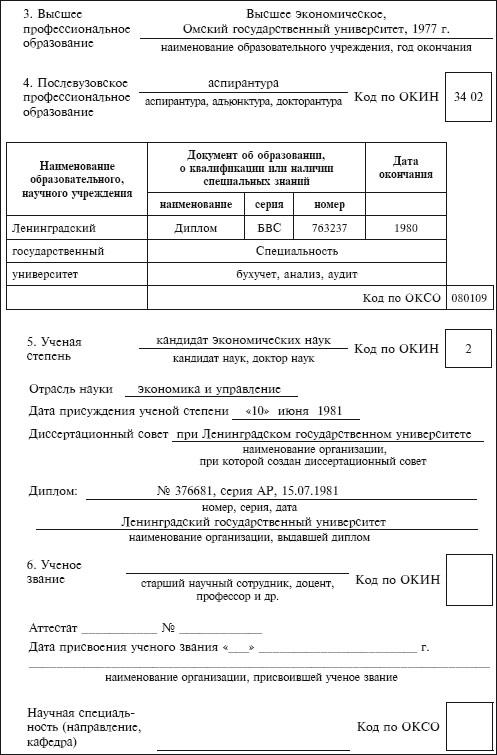 Сведения о высшем профессиональном образовании и послевузовском профессиональном образовании приводят, соответственно, в п. 3 «Высшее профессиональное образование» и п. 4 «Послевузовское профессиональное образование». Запись о высшем профессиональном образовании вносят на основании диплома, при этом указывают наименование образовательного учреждения и дату его окончания. В п. 4 записывают вид полученного образования: аспирантура, адъюнктура или докторантура. В таблице указывают наименование образовательного учреждения, дату его окончания, номер, серию и дату выдачи документа об образовании, полученную специальность.