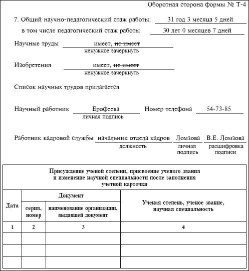 На оборотной стороне формы № Т-4 в п. 7 на основании записей в трудовой книжке и (или) иных подтверждающих стаж документов вносится запись об общем научно-педагогическом стаже работы, в том числе педагогическом. Здесь же указывают научные труды и изобретения работника, а к карточке прилагают список научных трудов.