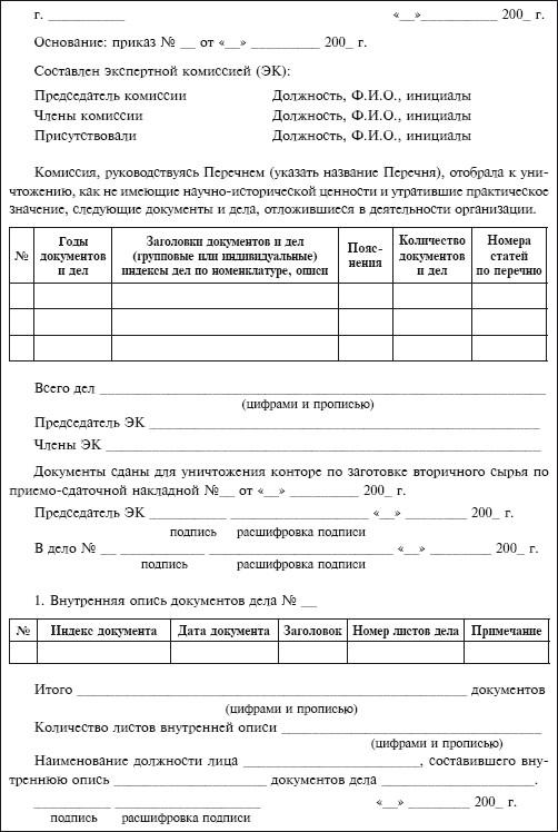 Уничтожение документов также осуществляет экспертная комиссия. При этом составляется акт о выделении документов к уничтожению. К акту прилагается опись дел с временными сроками хранения за определенный период времени. Описи дел и акты должны рассматриваться экспертной комиссией в едином комплексе и утверждаться руководителем организации.