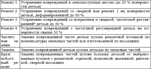 Некоторые наши заводы разрабатывают округленные нормативы для кузовного ремонта, введя категории сложности ремонта. Например, в ТУ4538-140-0023293-4 98 (с изменениями 1,2,3,4) «Приемка в ремонт, ремонт и выпуск из ремонта кузовов автомобилей ВАЗ предприятиями автотехобслуживания» категории кузовного ремонта выделены как показано в таблице[4].