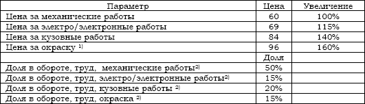 Пример вычисления средневзвешенной цены нормо-часа: составлено из цен реализации нормо-часа (без НДС) для механического, электрического, кузовного и малярного участков, и соответствующих оборота труда. В цены реализации нормо-часа для окраски не включены окрасочные материалы. Цены указаны в евро.