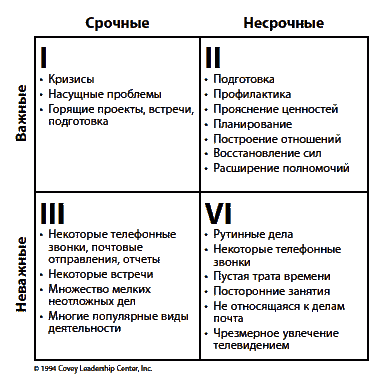 Если вы похожи на большинство людей, с которыми нам приходилось работать, то велика вероятность, что основная доля вашего времени приходится на квадранты I и III. Но какой ценой? Если вы руководствуетесь срочностью, какие важные – может быть, даже главные – дела не получают времени и внимания с вашей стороны?