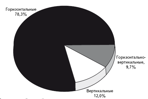 Слияния первой волны в основном носили горизонтальный характер (таблица 2.2 и рисунок 2.2). Многие горизонтальные слияния и отраслевые консолидации этого времени нередко приводили к почти монопольной структуре рынка. Поэтому этот период сыграл определенную роль в создании больших монополий и ассоциируется с первой миллиардной сделкой мегаслияния, когда U.S. Steel, основанная Дж. П. Морганом, объединилась с Carnegie Steel, основанной Эндрю Карнеги, и с другими своими крупными конкурентами. В получившемся стальном гиганте слились 785 отдельных компаний. В течение некоторого времени на U.S. Steel приходилось 75 % сталелитейных мощностей США.