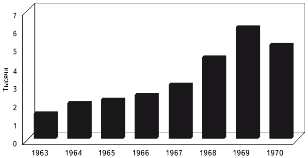 Рисунок 2.4. Объявления о слияниях и поглощениях за время третьей волны слияний, 1963–1970 гг. Третья волна слияний достигла своего пика в 1969 г. Падение фондового рынка в сочетании с налоговыми реформами уменьшило стимулы к слиянию.