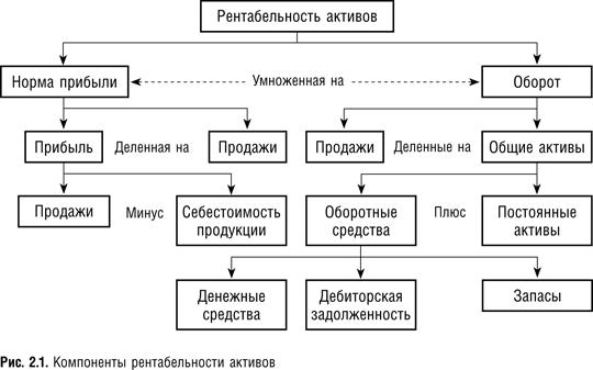 Как показано на рис. 2.1, показатель РА состоит из коэффициентов (на левой стороне рисунка) и оборота активов (на правой стороне рисунка). Умножение процента доходов на оборот активов дает рентабельность активов. Многие компании имеют давнюю традицию выдавливания всевозможных издержек из своих операций, что несомненно влияет на первую половину уравнения РА. Однако оборот активов либо игнорируется, либо получает гораздо меньший приоритет. Финансовому директору следует анализировать эту вторую часть расчета, чтобы увидеть, какие сокращения активов, в области как оборотного, так и основного капитала, могут быть сделаны для того, чтобы достичь более высокой РА.