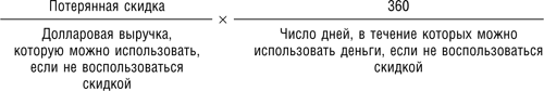 Некоторые поставщики делают пометку на своих счетах, что клиенту будет предоставлена скидка, если он оплатит счет в короткие сроки. Примером такого предложения является «2/10 N/30», что означает: «оставьте себе 2 % от цены, если вы заплатите в течение 10 дней, или оплатите всю сумму через 30 дней». Финансовый директор должен знать, как рассчитать экономию, которая будет получена от такого предложения. Основная формула следующая: