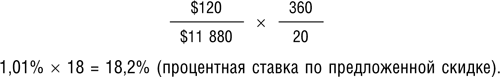 Например, Columbia Rafting Company имеет возможность получить 1 %-ную скидку по счету за новый надувной плот, если она сделает платеж через 10 дней. Счет выставлен на 12 000 долл. и обычно оплачивается через 30 дней. Расчет следующий: