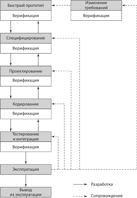 В предыдущей главе был рассмотрен ряд моделей, используемых в разработке ПО, в частности модель Build-and-fix (модель неполного жизненного цикла, рис. 3.1), которая в силу своей простоты не пригодна для больших и сложных проектов, имеющих размеры более 1000 программных строк. Также была рассмотрена модель быстрого прототипирования, которая тоже несколько ограниченна, несмотря на то что включает в себя все необходимые стадии жизненного цикла: анализ и спецификацию требований, первичное и детальное проектирование, реализацию, модульное и сборочное тестирование, интеграцию, тестирование продукта, передачу его заказчику, вывод из эксплуатации. Несмотря на это, она несамостоятельна, потому что на самом деле этап тестирования (и индивидуальных модулей, и при сборке) недостаточен, документация неполная, и продукт, получаемый на выходе, лишь моделирует функциональность той «боевой» системы, разработка которой ведется.