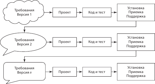 Осталось рассмотреть еще целый ряд моделей (рис. 3.3–3.5), которые достаточно важны для понимания того, каким образом можно организовывать жизненный цикл программных систем, в том числе и корпоративных, ведь эти модели существенным образом связаны именно с корпоративными информационными системами. Они ориентированы не на однократный проход по стадиям жизненного цикла, как это происходит в каскадной модели, а на последовательное уточнение функциональности продукта при движении по этим стадиям и, как правило, при неоднократном их прохождении.