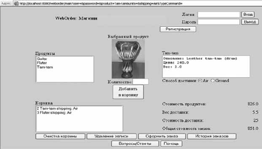 Итак, имеется экранная форма с каталогом продукции и списком продуктов. Например, выбран там-там. Имеется его фотоизображение, у него есть некое описание, более подробное, чем название, цена, указанная в условных единицах, вес в килограммах. Существует корзина, куда можно добавлять элементы из каталога. В корзине уже лежат два там-тама и дудочки в количестве трех штук. С помощью командных кнопок пользователь может выбрать вид доставки, осуществить удаление одного элемента из корзины или очистить ее целиком, может перейти к оформлению заказа, т. е. получить некий отчет о поступлении заказа в производство. Заказ получает номер, имеет общую стоимость и общий вес. Отдельно оплачивается стоимость доставки в зависимости от ее способа. Кроме того, есть кнопка «история заказов», которая говорит о том, что есть некая база данных или файл, где хранятся сведения о заказах, которые пользователи осуществляли ранее. Возможно, в зависимости от истории заказов пользователям будут предоставлены некоторые преимущества, например скидки или льготы по доставке. Далее происходит вычисление общей стоимости заказа. Есть кнопки, связанные со служебными функциями: кнопки регистрации, входа, помощи. Есть форма регистрации пользователя в системе. По логину система получает информацию о предыдущих заказах пользователя и может отслеживать свои взаимоотношения с клиентом.