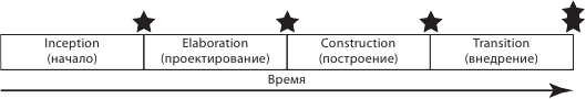 Поскольку речь идет об итерации, каждая стадия может повторяться большое количество раз (как минимум, три – четыре раза для серьезных программных продуктов). Эти стадии называются: начало, проектирование, построение, внедрение (рис. 5.1). Информация не является закрытой, она доступна на соответствующих интернет-ресурсах, т. е. это открытая, общедоступная методология. Более того, корпорации IBM и Microsoft стараются их популяризировать, давать возможность и сторонним разработчикам, и другим компаниям разрабатывать информационные системы.