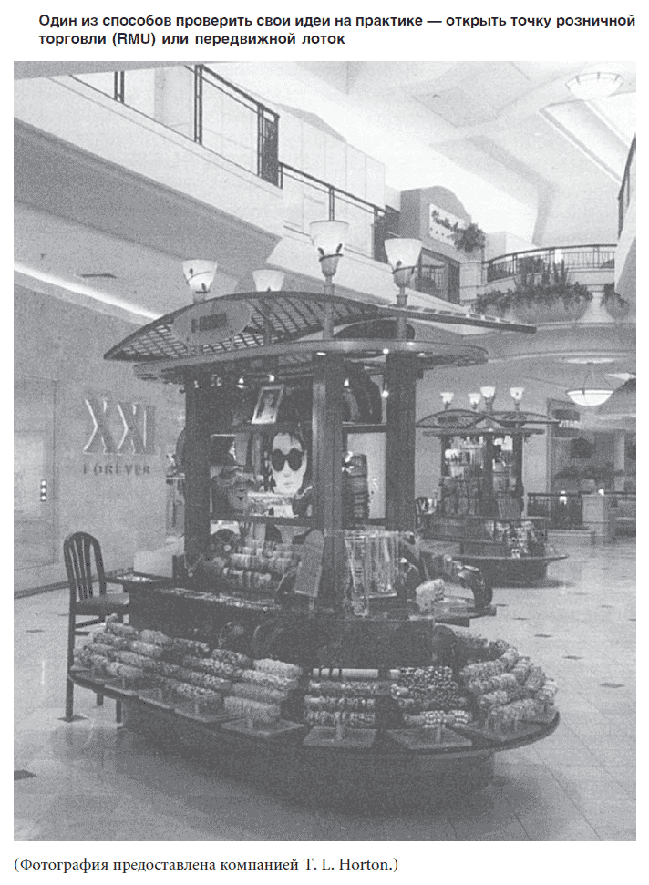 Открывать собственный розничный магазин для изучения рынка и проверки своих идей на практике – не всегда лучший вариант. Получить нужный опыт и информацию можно, арендовав киоск (см. фото далее) или передвижной лоток в крупном торговом центре. Владельцы подобных центров часто с удовольствием поддерживают такие мелкие розничные предприятия (иногда называемые точками розничной торговли или RMU), потому что они придают самобытность их комплексам, а иногда превращаются в постоянных арендаторов. Многие из таких киосков относятся к числу сезонных или временных торговых точек, чем выгодно отличаются от постоянных магазинов. Если вам понравилась эта идея, просмотрите журнал Specialty Retail Report и соответствующий веб-сайт (www.specialtyretail.com), содержащие информацию о готовых объектах «под ключ» для тех, кто решил арендовать киоск или передвижной лоток и хочет работать с одним поставщиком.