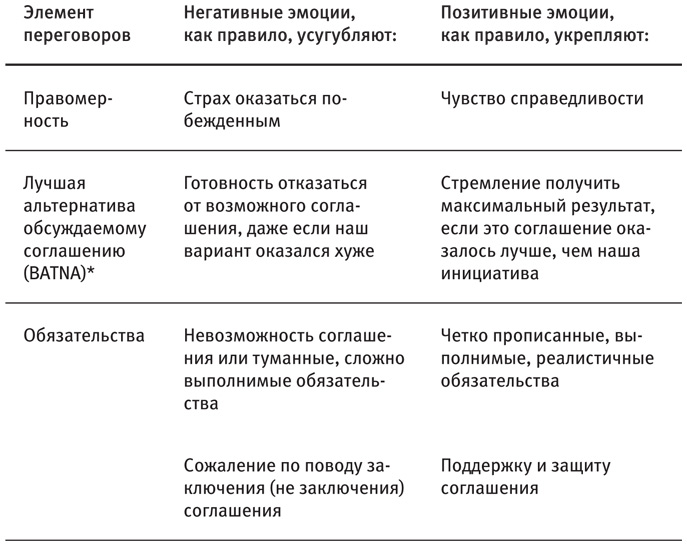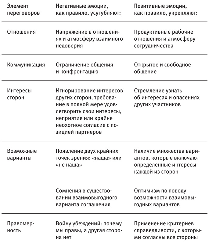 Из таблицы 1 вы узнаете, как положительные и отрицательные эмоции влияют на переговоры. В ней описано воздействие эмоций на семь основных элементов переговорного процесса.
