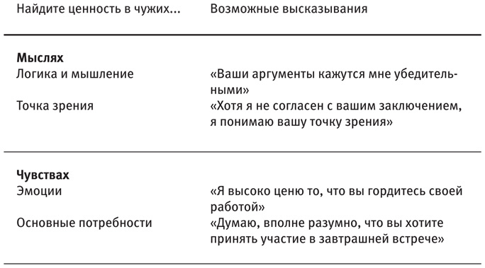 Второй шаг в признании другого человека – найти ценность в его мыслях, чувствах, поступках. Для этого достаточно оглядеться вокруг. Независимо от того, что мы делаем – возимся на кухне, застилаем кровать, подстригаем газон или не забываем о памятной дате, – мы чувствуем себя уязвленными, если наши усилия никто не ценит. В таблице 5 приведены примеры, каким образом можно найти ценность (и выразить ее) в том, что думает, чувствует и как поступает другой человек.
