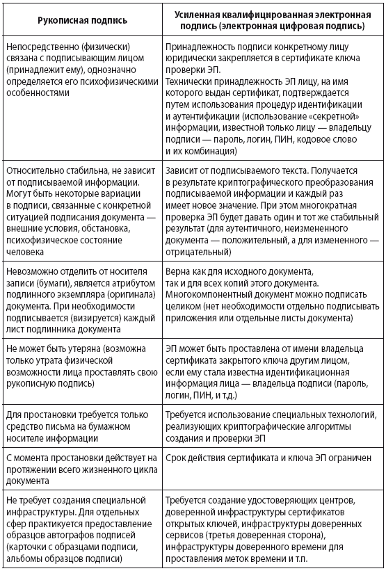 Самую высокую степень доверия к электронному документу обеспечивает усиленная квалифицированная электронная подпись, возможности которой аналогичны электронной цифровой подписи. Хотя Федеральный закон Российской Федерации от 10 января 2002 г. № 1-ФЗ в настоящее время утратил силу, понятие «электронная цифровая подпись» по-прежнему применяется в профессиональной литературе, когда речь идет о методах, способах формирования электронной подписи. Это же понятие присутствует в ГОСТ Р 34.10-2012 «Информационная технология. Криптографическая защита информации. Процессы формирования и проверки электронной цифровой подписи» [62]. Некоторые принципиально важные позиции сравнения УКЭП (ЭЦП) и рукописной подписи представлены в табл. 2.