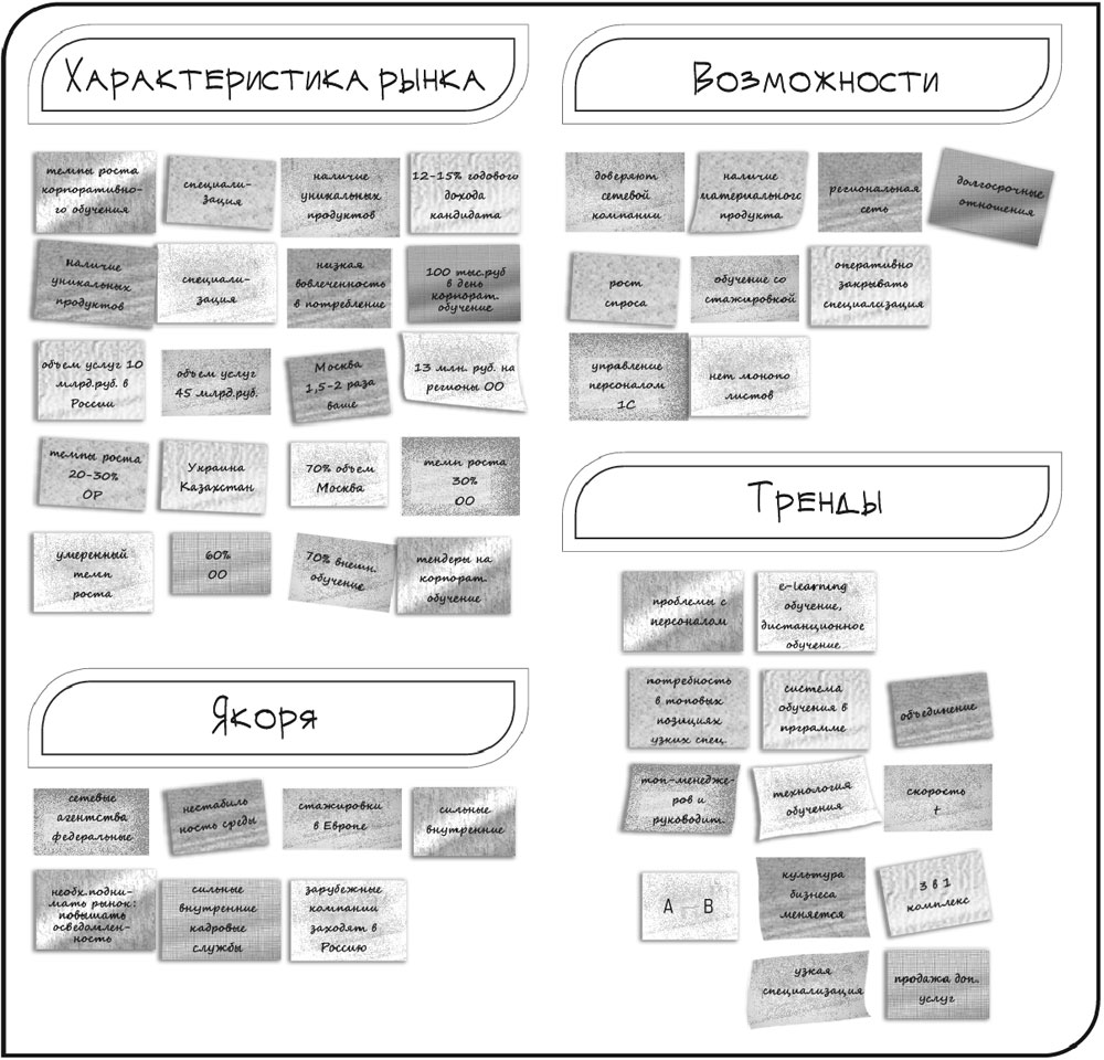 Разделите лист ватмана пополам по вертикали и горизонтали – в левый верхний квадрат, например, впишите все характеристики рынка, в левый нижний – сдерживающие развитие факторы (так называемые «якоря»). В правый верхний угол занесите возможности, в правый нижний – тренды. (Рис. 2)