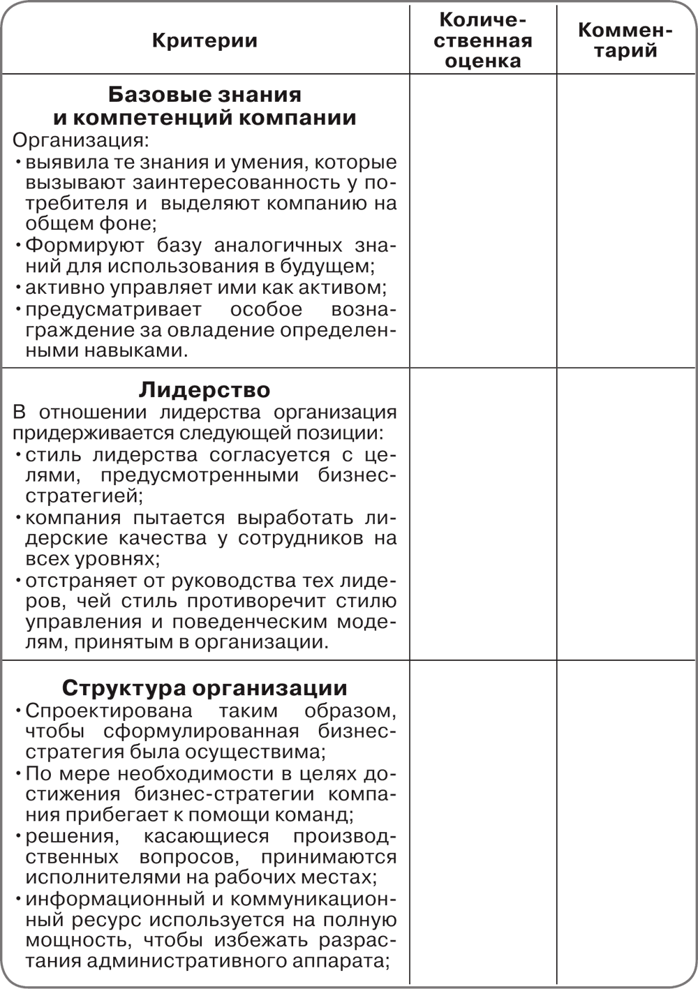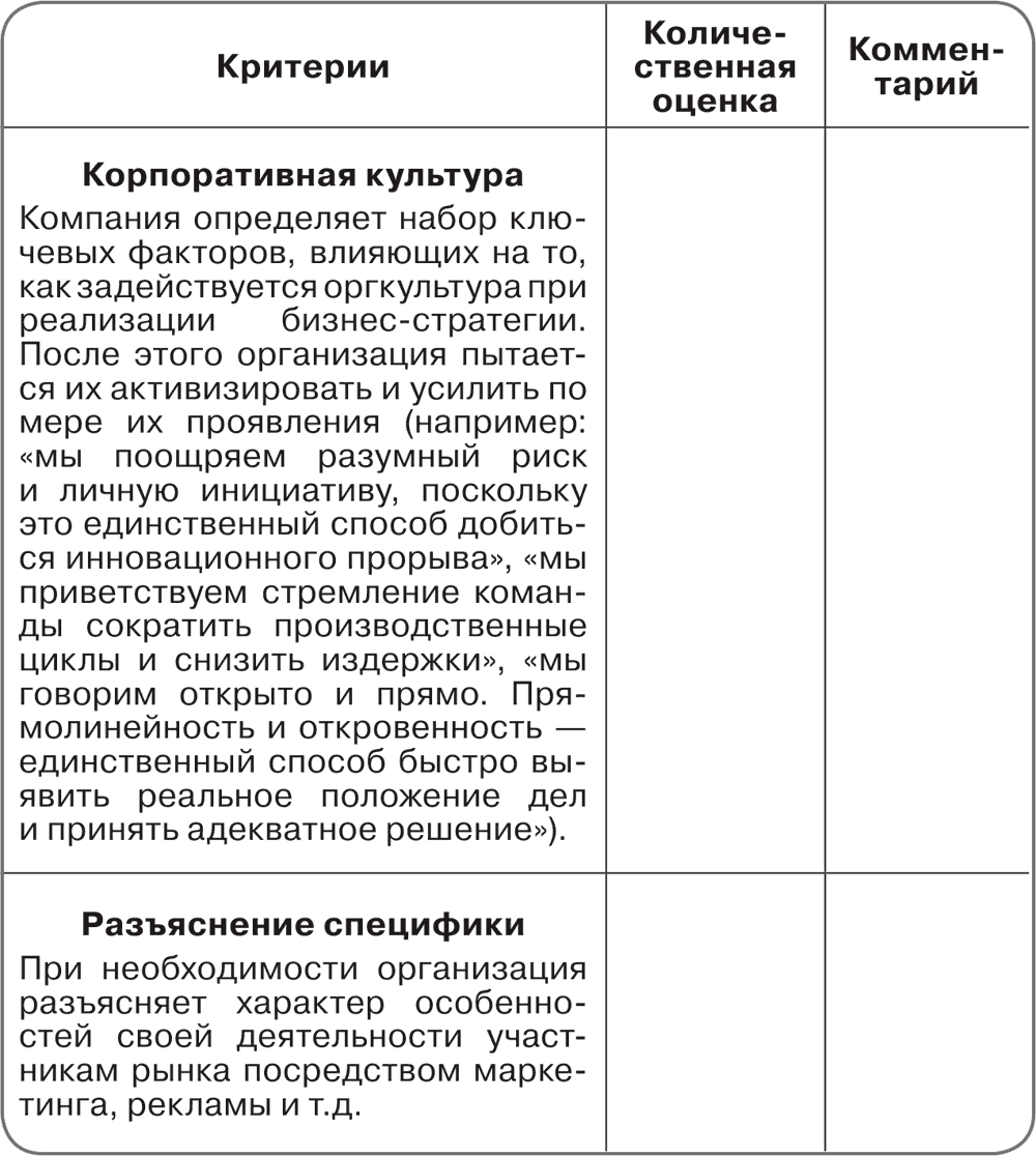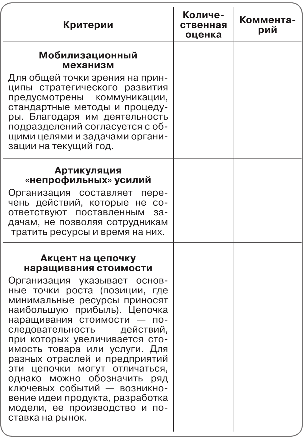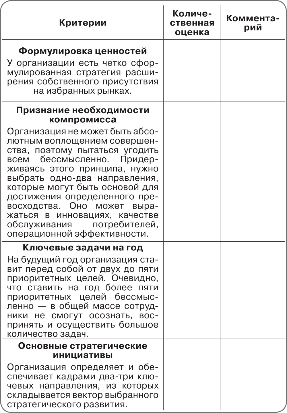 Перечисленные ниже критерии позволят оценить, насколько внятно в организации обозначены основные принципы и направления, требующие особого внимания, мобилизации ресурсов и защиты от конкурентов.