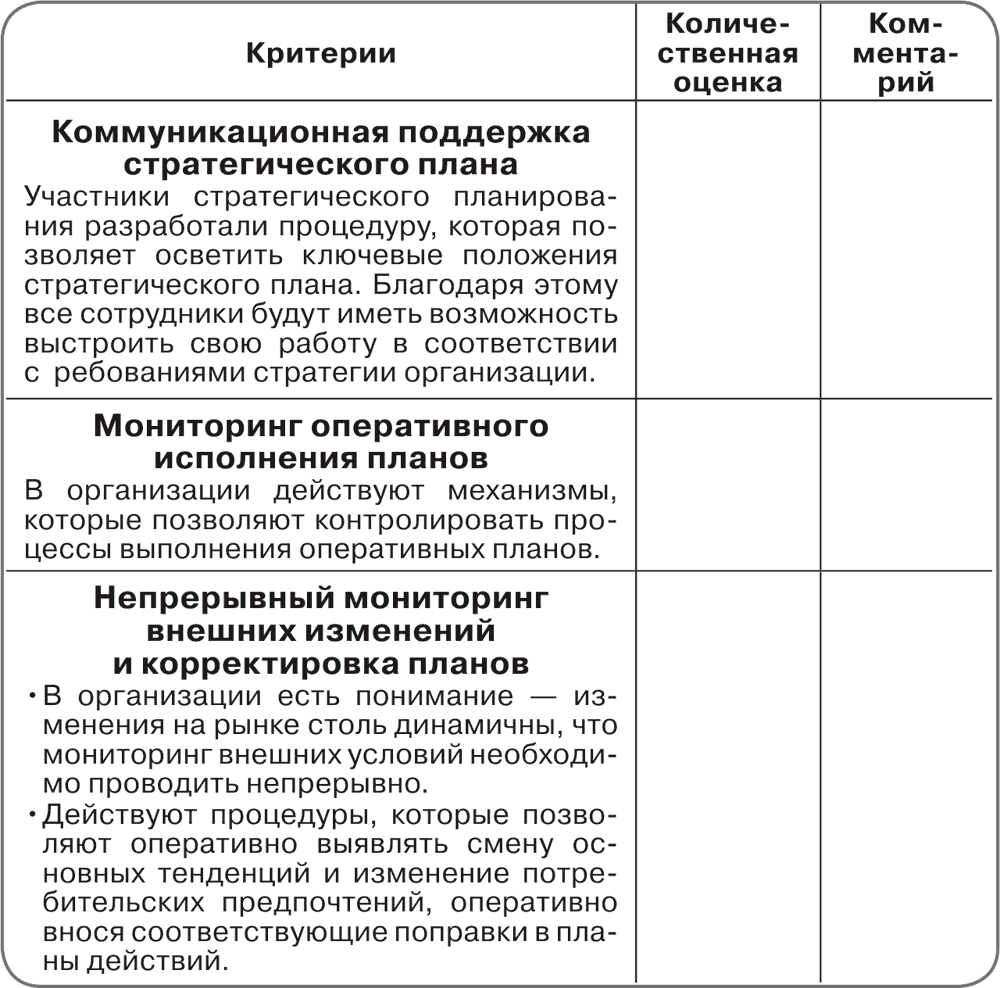 Каждая из этих категорий содержит набор субпараметров – они и являются критериями оценки стратегического плана компании.