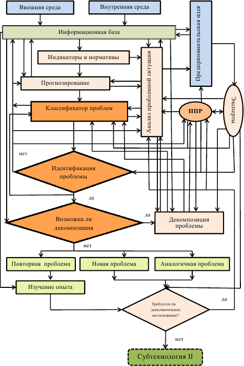 Субтехнология I является диагностическим блоком технологии разработки и принятия решения, состоящим из соответствующих информационных, аналитических, логических, прогностических и таксонометрических процессов и процедур. Этим определяется ее ключевое положение в предлагаемой технологии – без правильного определения имеющихся, возникающих и/или прогнозируемых проблем дальнейшие управленческие действия бесполезны и даже, вполне возможно, в силу их неадекватности ситуации губительны для управляемой предпринимательской структуры. В связи с этим обязательным условием является непосредственное участие в реализации этой субтехнологии предпринимателя (ППР) и экспертов, по крайней мере, в случае возникновения проблем, решение которых входит в круг его обязанностей или же представляют реальную или потенциальную угрозу успешной бизнес-деятельности.
