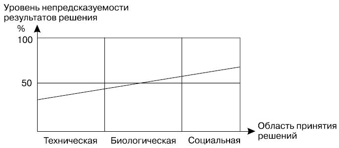 Рис. 1.1. Тенденции изменения непредсказуемости результатов реализации решений в различных системах