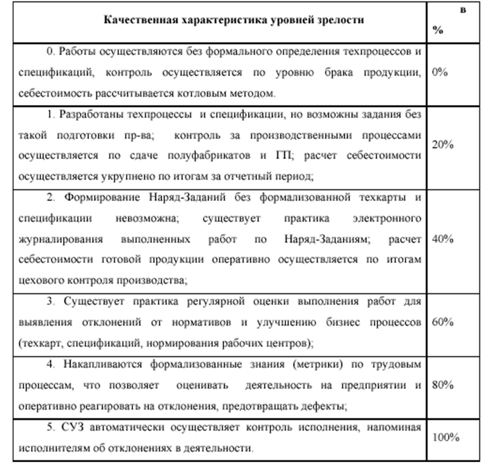 Таким образом, достижение 40 % по всем шести Ключевым процессам будет означать , что предприятие вышло на II-й уровень BPI. Если хотя бы у одного Ключевого Процесса не достигнута оценка 40 %, то считается, что предприятие находится на первом уровне BPI. Далее мы будем рассматривать использования практик, предложенных компанией QAD на базе ERP-системы MFG/PRO, для перехода предприятия с уровня I на уровень II.