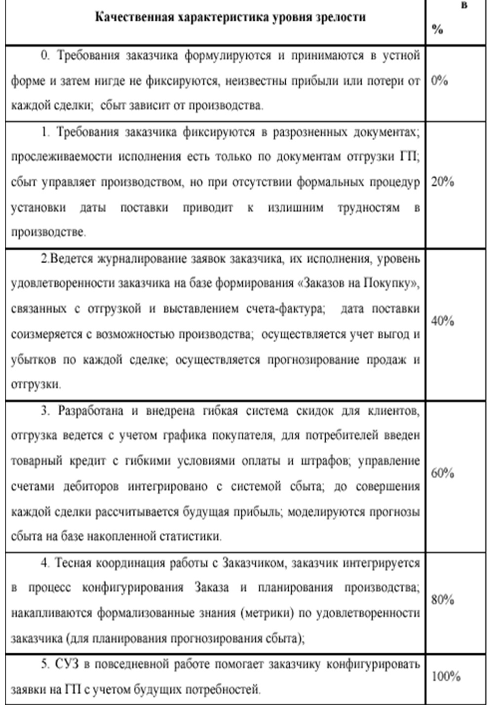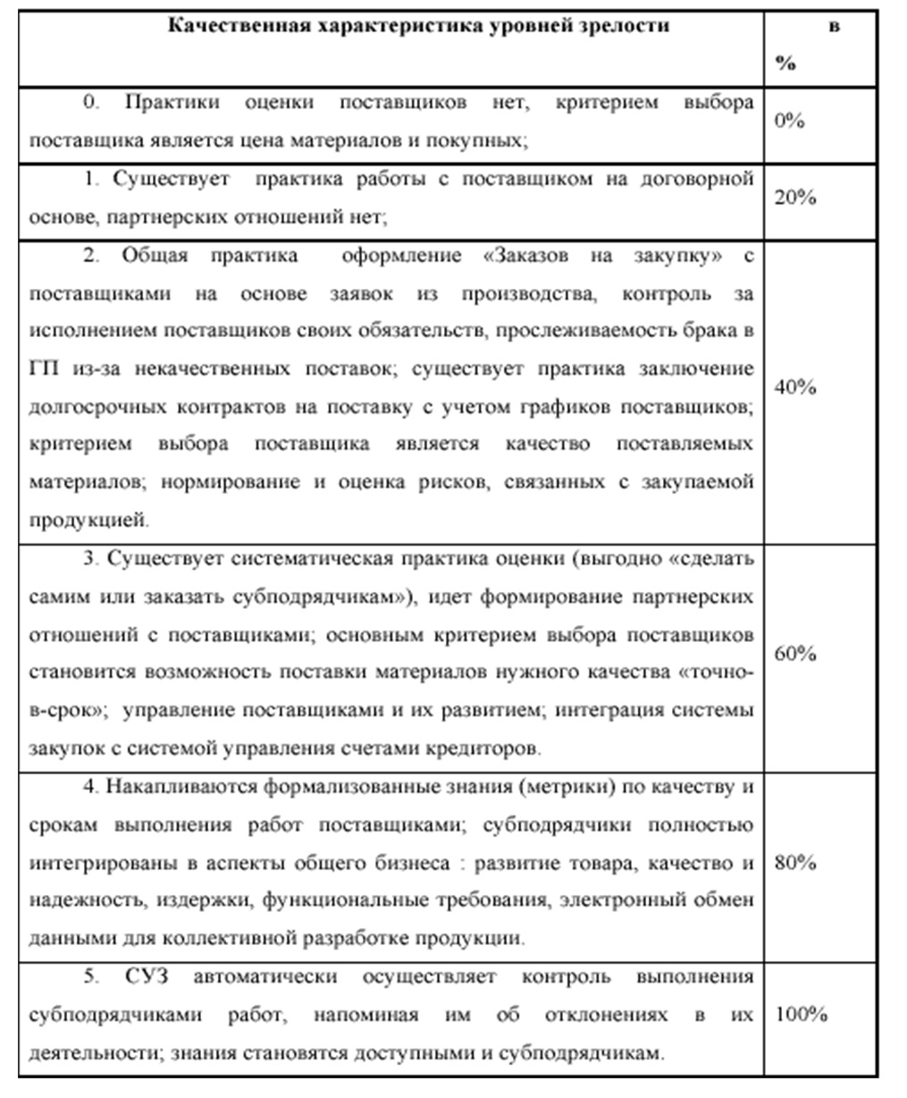 Далее будут рассмотрены цели в Ключевых Процессах. Ключевые Процессы соотносятся с элементами стандарта ИСО 9001:2000. Качественная и количественная оценка Ключевых Процессов соответствует следующим уровням BPI: 20 % – 1-й уровень BPI; 40 % – 2-й уровень BPI; 60 % – 3-й уровень BPI; 80 % – 4-й уровень BPI; 100 % – 5-й уровень BPI.