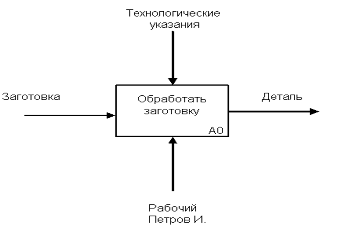 При построении IDEF0 – диаграмм важно правильно отделять входящие интерфейсные дуги от управляющих, что часто бывает непросто. К примеру, на рисунке 1.3.2 изображен функциональный блок “Обработать заготовку”.