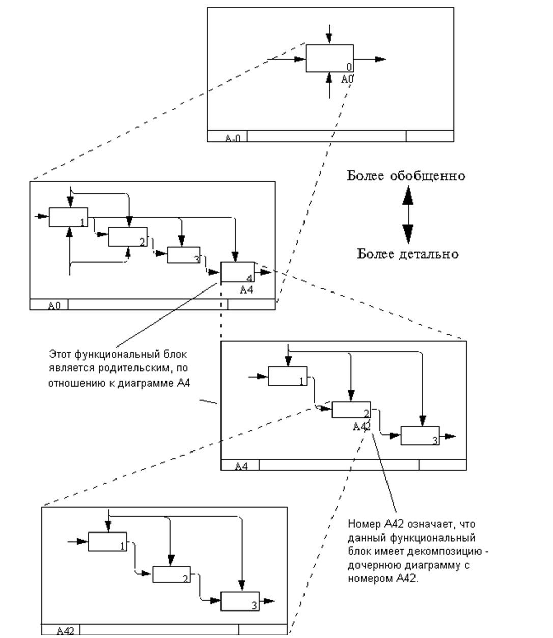 В процессе декомпозиции, функциональный блок, который в контекстной диаграмме отображает систему как единое целое, подвергается детализации на другой диаграмме. Получившаяся диаграмма второго уровня содержит функциональные блоки, отображающие главные подфункции функционального блока контекстной диаграммы и называется дочерней (Child diagram) по отношению к нему (каждый из функциональных блоков, принадлежащих дочерней диаграмме соответственно называется дочерним блоком – Child Box). В свою очередь, функциональный блок – предок называется родительским блоком по отношению к дочерней диаграмме (Parent Box), а диаграмма, к которой он принадлежит – родительской диаграммой (Parent Diagram). Каждая из подфункций дочерней диаграммы может быть далее детализирована путем аналогичной декомпозиции соответствующего ей функционального блока. Важно отметить, что в каждом случае декомпозиции функционального блока все интерфейсные дуги, входящие в данный блок, или исходящие из него фиксируются на дочерней диаграмме. Этим достигается структурная целостность IDEF0 – модели. Наглядно принцип декомпозиции представлен на рисунке 1.3.4.