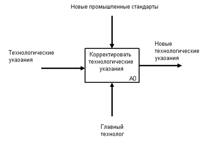 Другое дело, когда технологические указания обрабатываются главным технологом и в них вносятся изменения (рис. 1.3.3). В этом случае они отображаются уже входящей интерфейсной дугой, а управляющим объектом являются, например, новые промышленные стандарты, исходя из которых производятся данные изменения.