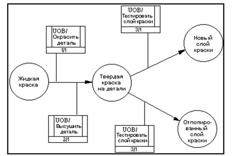 Если диаграммы PFDD технологический процесс "С точки зрения наблюдателя", то другой класс диаграмм IDEF3 OSTN позволяет рассматривать тот же самый процесс "С точки зрения объекта". На рис. 1.3.9 представлено отображение процесса окраски с точки зрения OSTN диаграммы. Состояния объекта (в нашем случае детали) и Изменение состояния являются ключевыми понятиями OSTN диаграммы. Состояния объекта отображаются окружностями, а их изменения направленными линиями. Каждая линия имеет ссылку на соответствующий функциональный блок UOB, в результате которого произошло отображаемое ей изменение состояния объекта.