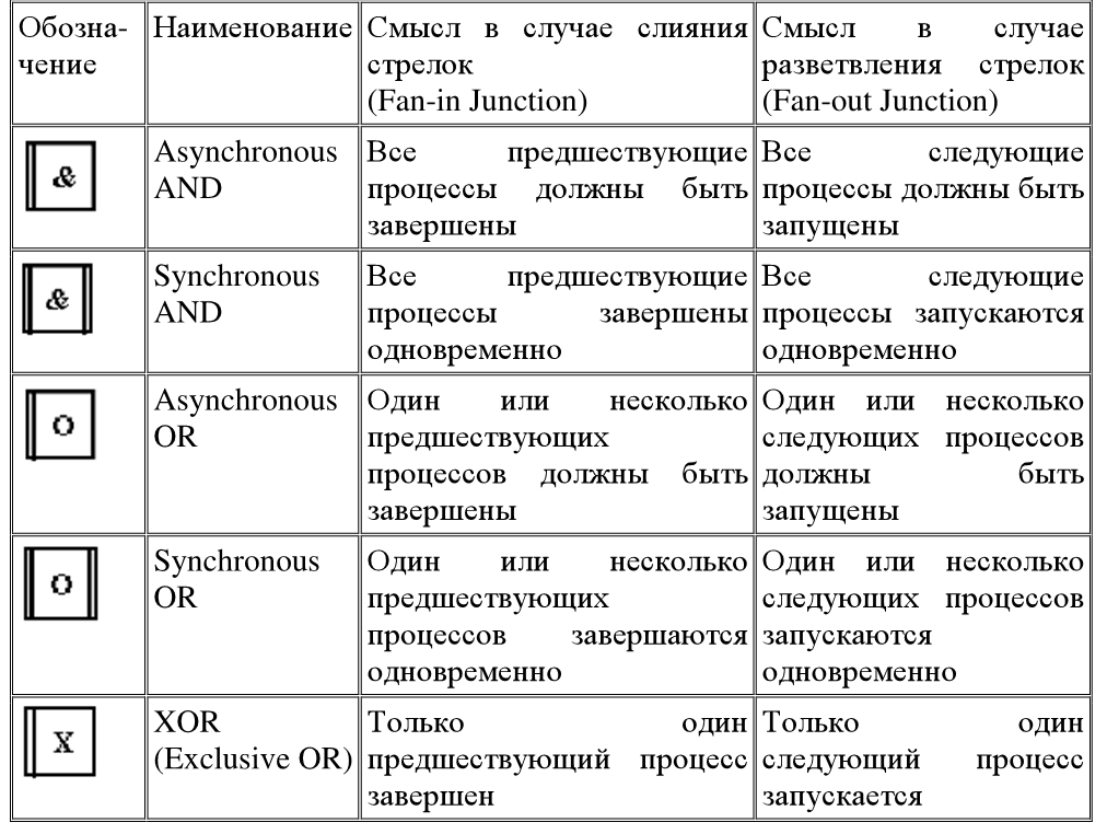 Различают перекрестки для слияния (Fan-in Junction) и разветвления (Fan-out Junction) стрелок. Перекресток не может использоваться одновременно для слияния и для разветвления. При внесении перекрестка в диаграмму необходимо указать тип перекрестка. Классификация возможных типов перекрестков приведена в таблице 1.3.1