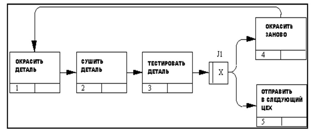 На следующем примере, опишем, как графические средства IDEF3 позволяют документировать вышеуказанный производственный процесс окраски детали. В целом, этот процесс состоит непосредственно из самой окраски, производимой на специальном оборудовании и этапа контроля ее качества, который определяет, нужно ли деталь окрасить заново (в случае несоответствия стандартам и выявления брака) или отправить ее в дальнейшую обработку.
