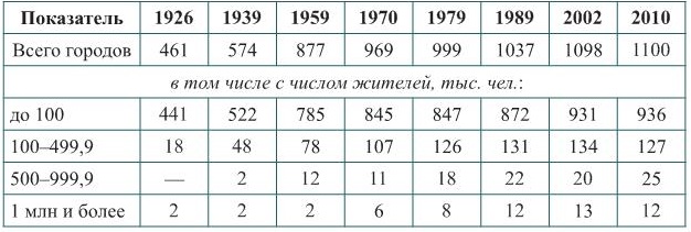 В европейской части России в середине ХIХ в. в городах проживало лишь 5 % населения страны. Но уже с 1850 по 1914 г. городское население увеличилось в 3 раза. Это был период бурного индустриального развития, этап урбанизации. С середины 1970-х гг. наблюдается этап стабилизации, переход к экстенсивным формам управления развитием системы городского расселения. С 1990-х гг. в России происходит замедление роста городов, мировые глобализационные процессы захватывают страну. Сегодня Россию можно назвать урбанизированной территорией. На 14 октября 2010 г. в стране насчитывалось 2386 городских поселений: городов и поселков городского типа, в которых проживает 73,7 % россиян. Среди них – 1100 городов, 85 % которых составляют города с численностью населения до 100 тыс. жителей, и число их продолжает расти. Число самых крупных городов, в которых проживает миллион человек и более, устойчиво росло до 1989 г., а затем практически стабилизировалось.