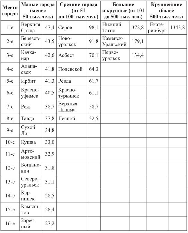 Городское население Свердловской области сосредоточено в двух полярных типах поселений – в городе-миллионнике Екатеринбурге (1411,1 тыс. чел., 2013 г.) и в малых и средних городах (1460,1 тыс. чел., 2010 г.). Следовательно, проблемы городов Свердловской области – это главным образом проблемы мегаполиса (крупнейшего города) и проблемы малого города.