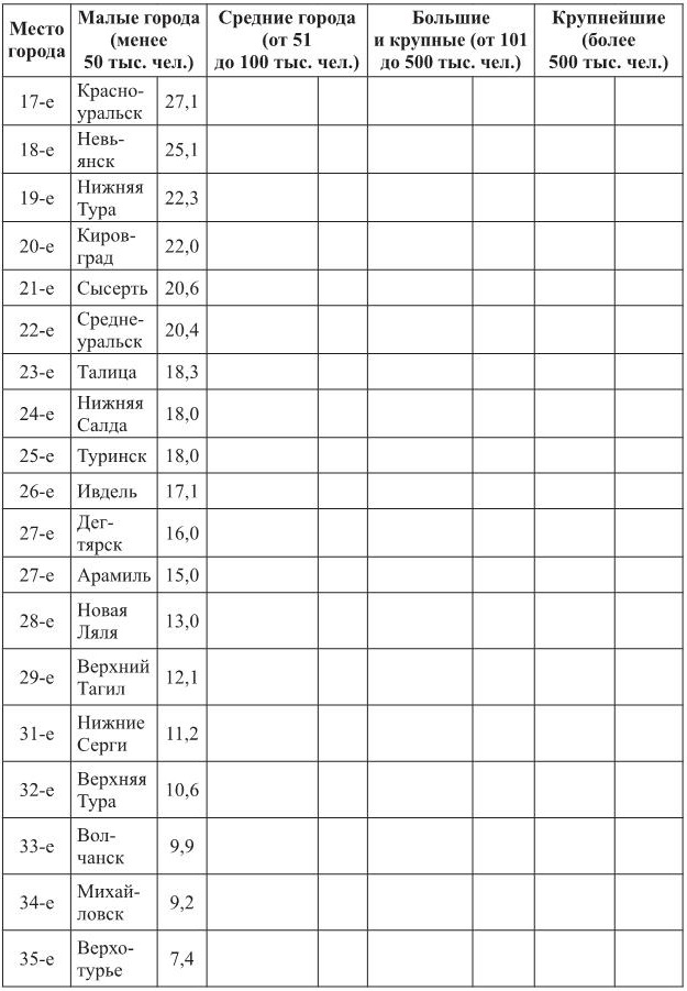 Усиливается агломерационный эффект. Среди крупнейших центров, концентрирующих вокруг себя другие поселения, можно выделить такие города, как Екатеринбург, Нижний Тагил, КаменскУральский, Серов, Асбест. Зоны радиусом 50 км, а в ряде случаев – более 100 км, являются территориями активного влияния городов-центров. Такие зоны могут, как правило, быть очерчены изохроной 1,5-часовой транспортной доступности центра города. В целом по стране число менее крупных городов изменялось за счет повышения ранга одних городов и снижения других, переходящих в группу городов меньшего размера. Устойчивый рост, характерный для предшествующих десятилетий, прекратился. К этой картине следует добавить, что к настоящему моменту урбанизацией охвачены сравнительно небольшие территории в Европейской России, а за Уралом – только узкая полоса вдоль Транссибирской магистрали.