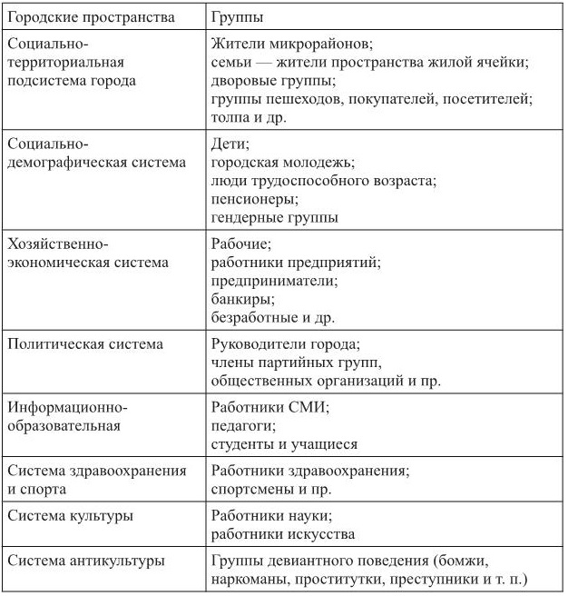 Сложность рассмотрения города как системы усугубляется тем обстоятельством, что любой элемент городской системы – многокомпонентное образование, он также может быть представлен в виде особой системы. В зависимости от выбранного критерия, элементы города можно группировать бесконечным образом. Так, экономическая система города подразделяется на такие подсистемы, как хозяйствующее население, градообразующие отрасли, градообслуживающая сфера и пр. Городской социум, который образуют жители городов, по критерию «время пребывания в городской среде» можно подразделить на такие группы, как типичные горожане, городские маргиналы, гости города. Типичные горожане, в свою очередь, также весьма неоднородны, их можно представить как систему городских социальных групп (табл. 3).